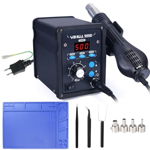 YIHUA 959D ホットエアーガンは、温度調節機能を備えた高性能な熱風工具です。電子部品の半田付けや、接着剤の除去に最適で、使いやすいデザインが特徴です。