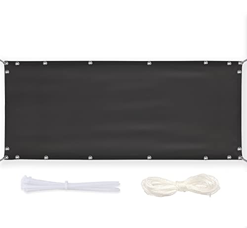 バルコニー シェード 120x250cmは、雨風を防ぎ、遮光性が高いデザイン。付属の紐と結束バンドで簡単に取り付け可能。ウッドデッキやベランダ、庭の柵に最適。濃い灰色のカラーで目隠し効果も抜群。