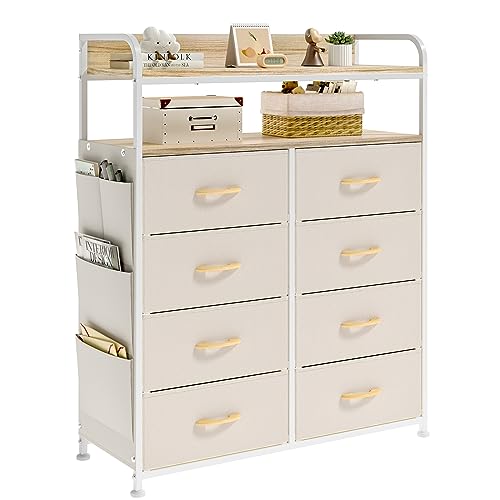 REAHOME 2段棚タンスは、おしゃれなデザインで側面収納ポケット付き。高通気性カチオン生地(ベージュ)を使用し、衣類や布製引き出しの整理に最適。リビングや脱衣所、洗面所にぴったりのキャビネットです。