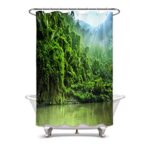 LBのバスカーテンは、緑の森と川が美しい自然風景をデザイン。ポリエステル生地で防水・防カビ加工済み。遮像性があり、目隠しにも最適。リング付属で簡単取り付け。サイズは120x175cm。