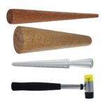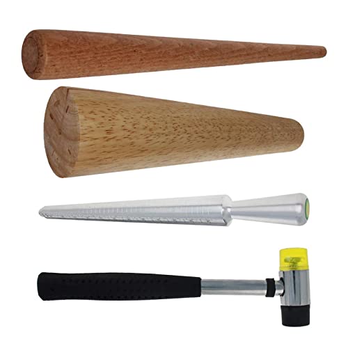 リングゲージ、ハンマー、ゲージ棒、リングサイズ調整工具の4点セット。指輪のサイズ補修に最適なジュエリー用工具です。