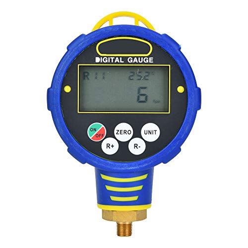 空調冷媒R32対応のデジタル圧力計。低圧測定ツールで電池寿命30時間。82種類の冷媒圧力データを内蔵し、真空測定も可能です。