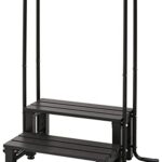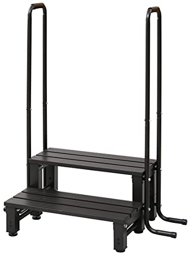 ガーデンマスターの両取っ手付きアルミ2段踏み台は、幅98.5cm、奥行53cm、高さ118cmで耐荷重80kg。バルコニーやデッキの段差解消に便利なダークブラウンのデザインで、介護にも対応します。