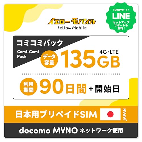 / 【日本国内専用】プリペイドSIM 135GB/90日間利用可能 docomo回線 4G/LTE対応 3in1サイズ SIMカード YELLOWMOBILE Band 1/3/19/21/28対応 日本語マニュアル付属 データ通信専用 国内旅行・出張に