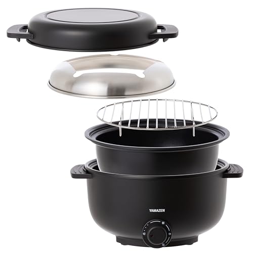 山善の電気鍋グリル鍋YMCP-S650(B)は、一人用の小型卓上鍋で、焼く、蒸す、揚げる、煮る、フォンデュの5WAY対応。温度調整機能付きで、着脱式・丸洗い可能なデザインです。