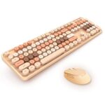 甘いミルクティーカラーのワイヤレスキーボードとマウスのコンボ。104キーのレトロタイプデザインで、2.4GHzワイヤレス接続。XP、Win7、Win8、Win10と互換性あり。