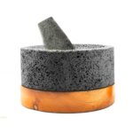8インチの木製スタンド付きモルカヘテ。火山石製で、メキシコ手作り。ワカモレやサルサ作りに最適。すりこぎ石付き。