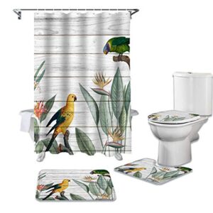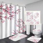 シャワーカーテン4点セット、フラワー柄で防水・防カビ仕様。便座クッションや滑り止めカーペット、U字型輪郭クッション付き。北欧風の浴室装飾に最適。サイズ150×180cm。