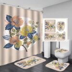 シャワーカーテン4点セット、フラワーデザインで防水・防カビ。便座クッション、滑り止めカーペット付き。北欧風で浴室をおしゃれに演出。速乾性あり。サイズA150*180。