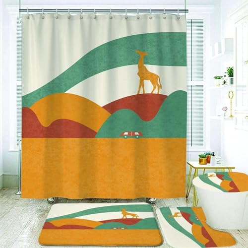 シャワーカーテン4点セットは、動物デザインの防水シャワーカーテン、便座クッション、滑り止めカーペットを含みます。防カビ・速乾性あり。サイズは150*180cm、北欧風で浴室装飾に最適です。