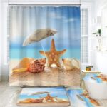 シャワーカーテン4点セット、猫デザインで防水。便座クッションや滑り止めカーペット付き。防カビ、速乾素材で北欧風。サイズ150*180cm、ユニットバス用。