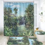 シャワーカーテン4点セット。滑り止めカーペット、トイレカバー、U字型クッション付き。サイズ150*180cmで耐久性あり。取付簡単、お手入れも簡単。