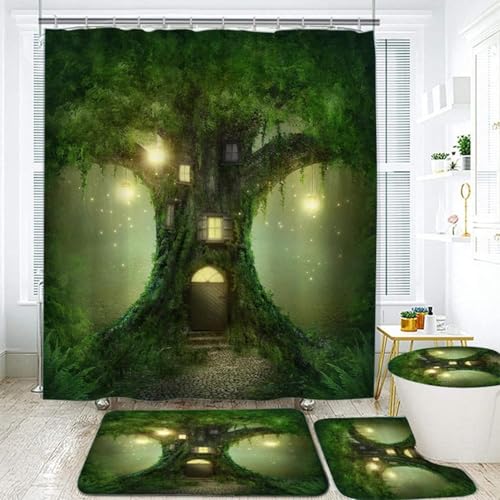シャワーカーテン4点セットは防水で、防カビ仕様。便座クッションや滑り止めカーペットが含まれ、U字型の輪郭クッションも。北欧風スタイルで、速乾性があり、浴室装飾に最適。サイズ150*180cm。