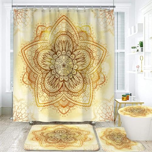 シャワーカーテン4点セットは、幾何学模様で防水性抜群。便座クッションと滑り止めカーペット付き。防カビ・速乾機能もあり、北欧風のデザインが魅力。150*180サイズあり、浴室をおしゃれに演出。