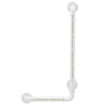 夜間光るL型トイレ用手すり。ステンレスチューブ+抗菌ナイロン製で、耐荷重300kg。転倒防止、静電気なし。穴あけが必要で、身体障害者や高齢者に最適。サイズ:60cm×40cm。