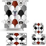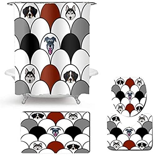 4ピースの犬モチーフのカーテンセット。防水素材で、シャワーやトイレに最適。サイズは180×180cm。かわいらしいデザインでバスルームを彩ります。