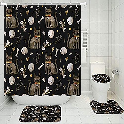 4ピースカーテンと猫の頭蓋骨デザインのashowerカーテン、トイレクッション、バスルームセットです。3D印刷で洗えるトイレU字型クッション、フロアカーペットは180×180センチメートルのサイズです。