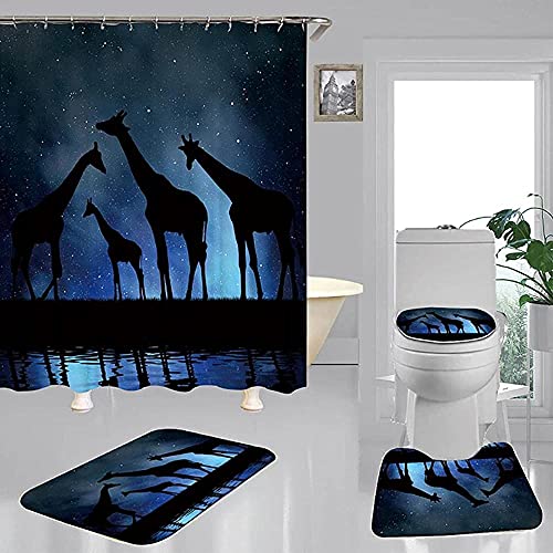 防水シャワーカーテン4ピースセット。カーペットカバー、トイレカバー、バスマット、クッションカバーが含まれ、ユニークなキリンデザイン。サイズは180×180センチ。