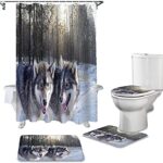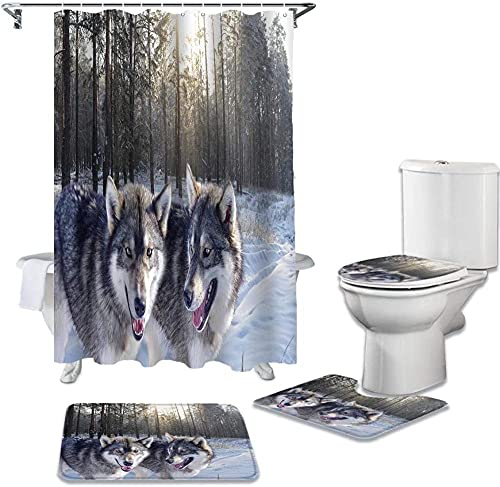 4ピースセットのオオカミ冬のシャワーカーテンは、防水仕様で、バスルームをおしゃれに演出。便座クッションやノンスリップカーペットも含まれ、サイズは180×180センチメートル。