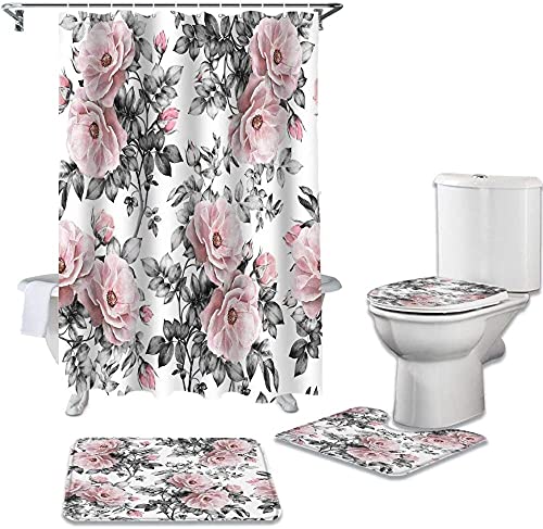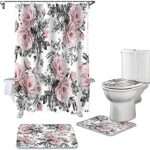 4 ピースセット花束ローズ印刷シャワーカーテン防水バスルームカーテン便座クッションノンスリップカーペットセットバスタブ装飾 180 × 180 センチメートル