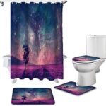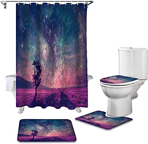 4ピースセットの夢の風景デザイン。スカイツリーと月を描いた防水シャワーカーテン、バスタブ装飾、カーペット、便座クッション付き。サイズは180×180センチ。