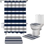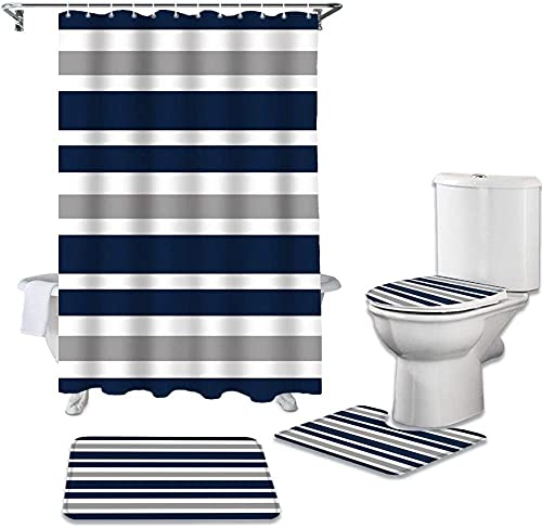 縞模様の青、白、グレーの4点セット印刷シャワーカーテン。防水仕様で、バスルームをおしゃれに演出。便座クッションとノンスリップカーペット付き。サイズは180×180センチメートル。