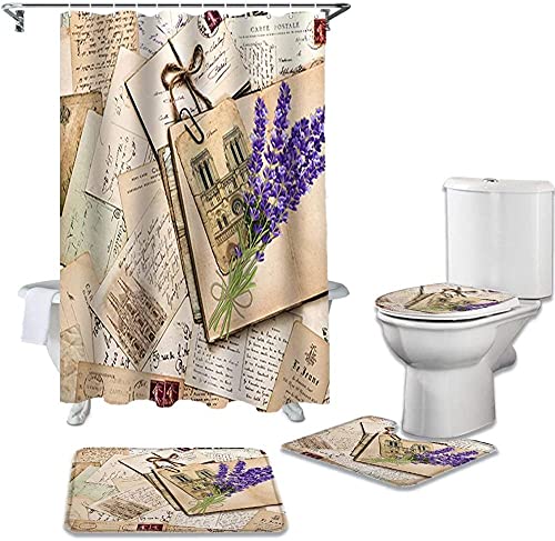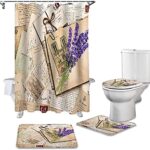 4ピースセットで、ラベンダーのデザイン。防水バスルームカーテン、便座クッション、ノンスリップカーペットが含まれ、サイズは180×180cmです。浴室に華やかさを加えるアイテムです。