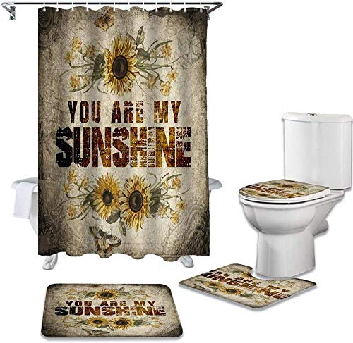 4ピースのレトロひまわりデザインの耐久性ある防水シャワーカーテンセット。バスルームカーペット、便座カバー付きで、180×180cmのサイズです。