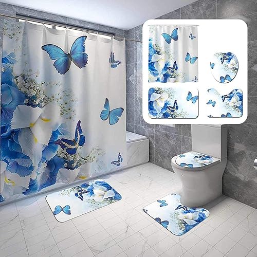 蝶プリントシャワーカーテン4点セットは、美しい蝶柄が特徴のバスルームアクセサリーです。耐水性素材で作られ、洗濯可能。カーテンとバスマット、ストッパー、フックが含まれています。