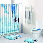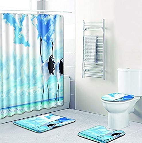 4ピースのピンクの鳥のデザインが施されたシャワーカーテンとフロアマットのセットです。サイズは180×180センチメートルで、バスルームやトイレに最適なカーペットとクッションフロアマットが含まれています。