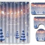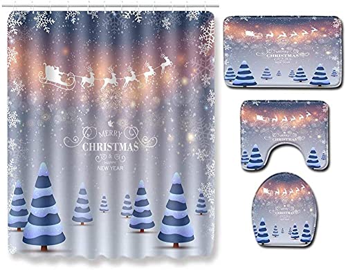 4ピースクリスマスシャワーカーテンとフロアマットのセット。180x180cmのシャワーカーテン、トイレカーペット、フットクッション付きで、バスルームを華やかに演出します。