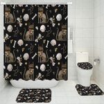 4ピースカーテン猫の頭蓋骨デザインのシャワーカーテンとトイレクッションセット。3D印刷で洗えるU字型クッションが特徴。バスルームに最適な180×180センチメートルのフロアカーペット付き。