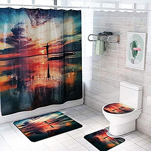 美しい夕暮れの海をデザインした防水ポリエステル製の3Dシャワーカーテンセット。4ピースで、ノンスリップカーペット、シャワーカーテン、クッション、12フック付き。サイズは180×180センチメートル、家の装飾に最適。