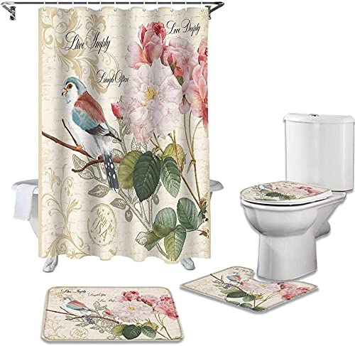 4ピースのレトロ手紙鳥デザインの浴室用セット。シャワーカーテン、カーペットカバー、トイレカバー、バスマット、クッションカバーが含まれ、サイズは180×180センチメートル。家の装飾に最適。