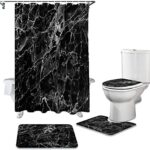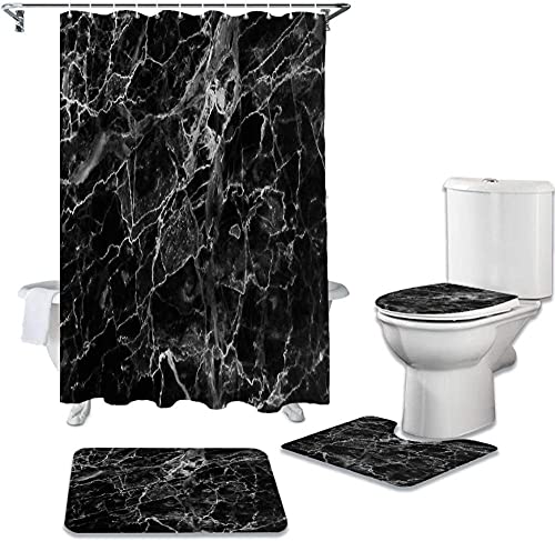 防水バスルームに最適な4ピースセットです。黒大理石プリントのデザインは高級感を演出。カーテンは180×180cmで、便座クッションとノンスリップカーペットが含まれています。