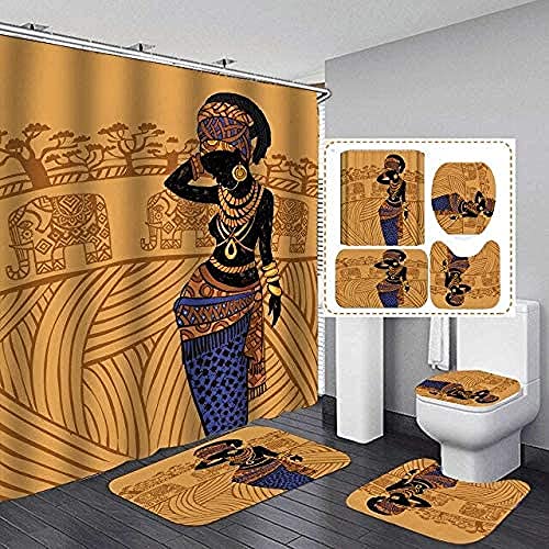 アフリカの女性をテーマにしたプリントシャワーカーテンの4点セット。カーペット、トイレカバー、バスマット、クッションカバー含む。サイズは180×180cm、12フック付属。