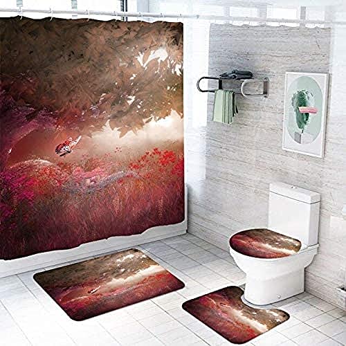 4ピースドリームフォレストバスルームセットは、180×180センチのポリエステル製シャワーカーテン、トイレリップカバー、バスルームカーペットを含むセットです。デザインは夢のような森林をテーマにしています。