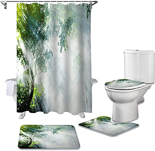 サンシャインフォレストグリーンの4ピースセット。植物デザインのシャワーカーテン、カーペット、トイレカバー、バスマットが含まれ、サイズは180×180 cm。おしゃれなバスルームの装飾に最適です。