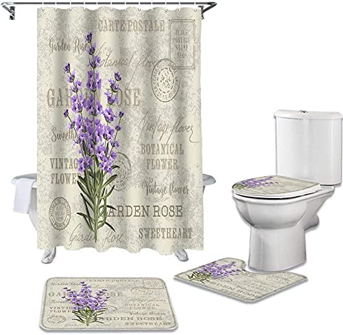 / 4 ピースバスルームシャワーカーテンラベンダー紫の花の葉レトロベースカーペットカバーカーペットトイレカバーセットシャワーカーテンクッションセット 180 × 180 センチメートル