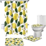 4ピースシャワーカーテンセットは、サマーフルーツデザインのパイナップルとグリーンリーフが特徴。耐久性のある防水素材で、バスルームカーペットと便座カバーも含まれ、サイズは180x180cmです。