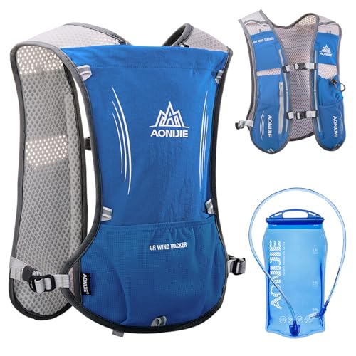 AONIJIEのハイドレーションバックパックは5L容量で、1.5Lのウォーターブラダー付き。軽量かつ通気性に優れ、アウトドアやスポーツに最適。マラソンやトレイル、ハイキングにも対応。