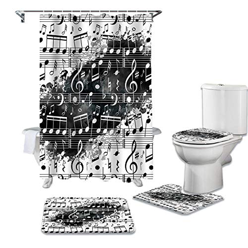 HGFHKLLのミュージックノートデザインの白黒スプラッシュシャワーカーテン、カーペットカバー、トイレカバー、バスマット、クッションカバーなどを含む4点セットの家の装飾アイテムです。