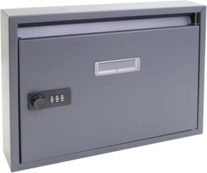 郵便ボックスはダイヤルロック式で、横型の薄型デザイン。グレーの外観がシンプルで、郵便物の盗難対策にも優れています。暗証番号でセキュリティを確保し、壁に簡単に取り付け可能です。