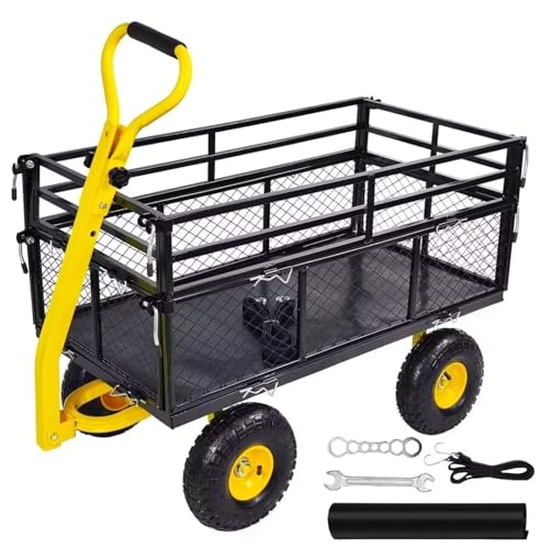 TUIYIDUOガーデンカートは耐荷重650KGの多機能運搬車です。エア注入式タイヤ、取り外し可能な側面を備え、家庭用や引越しに便利。サイズは110.5x75x82cm。