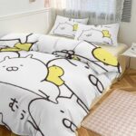 うさまるデザインの布団カバー3点セット。掛け布団カバー、枕カバー、シーツカバーが含まれ、肌に優しく快適な素材を使用。洗濯機OKで速乾性もあり、使い勝手抜群の寝具セットです。