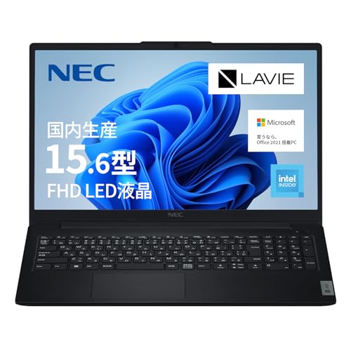 NEC LAVIE 23夏N15 Slimは15.6型ノートPC。Intel U300、メモリ8GB、SSD256GB、MS Office 2021搭載。Windows11でバッテリー駆動は13.2時間、重量1.65kgのブラックモデルです。
