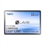 NEC LAVIE T11は11インチ、Wi-FiモデルのAndroidタブレット。MediaTek Helio G88プロセッサ、4GB RAM、64GBストレージを搭載。広視野角のLED液晶を採用し、ルナグレーのデザインです。