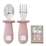 赤ちゃん用のスプーン・フォークセット。離乳食に最適で、10ヵ月以上の子供が自分で食べる練習に便利。握りやすく、SUS316Lステンレス製で安全性も抜群。アッシュローズ(テディ)デザイン。