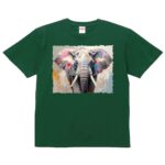 ネクラスのカラフルな象デザインTシャツ。グリーンカラー、Sサイズ。メンズ・レディース・ジュニア・キッズ対応。素材はコットン100%、半袖、5.6オンスの快適な着心地。