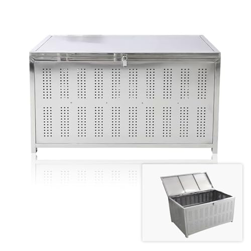 大容量の金属製ゴミ収集ボックス。屋外用で通気性があり、ハンドル付きで移動も楽々。野良猫対策にも最適な庭用ゴミ収納庫です。